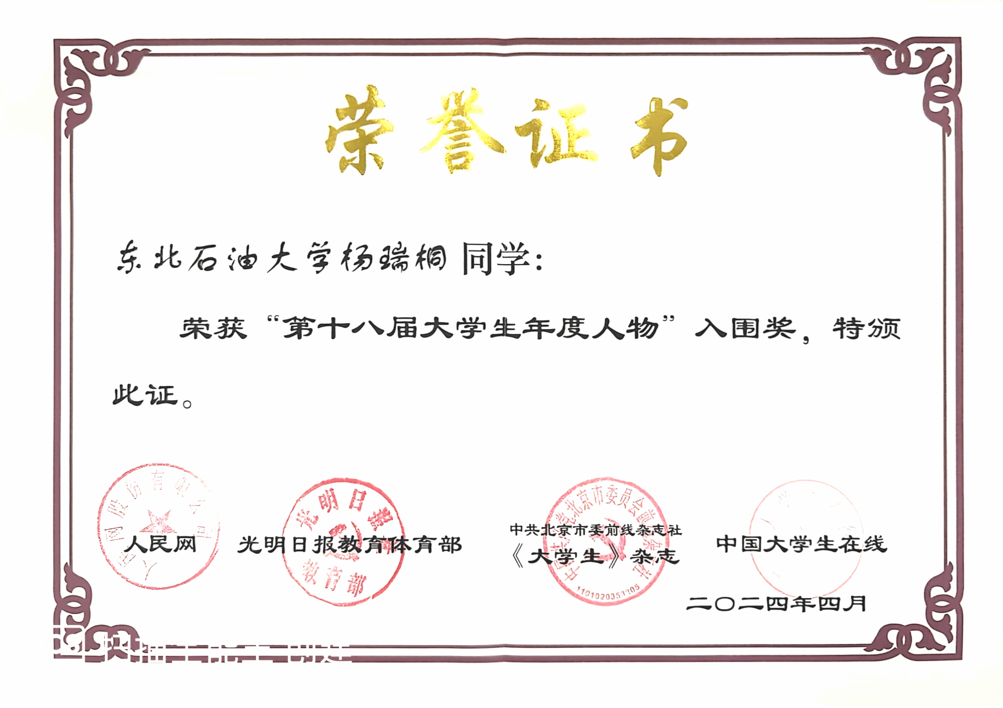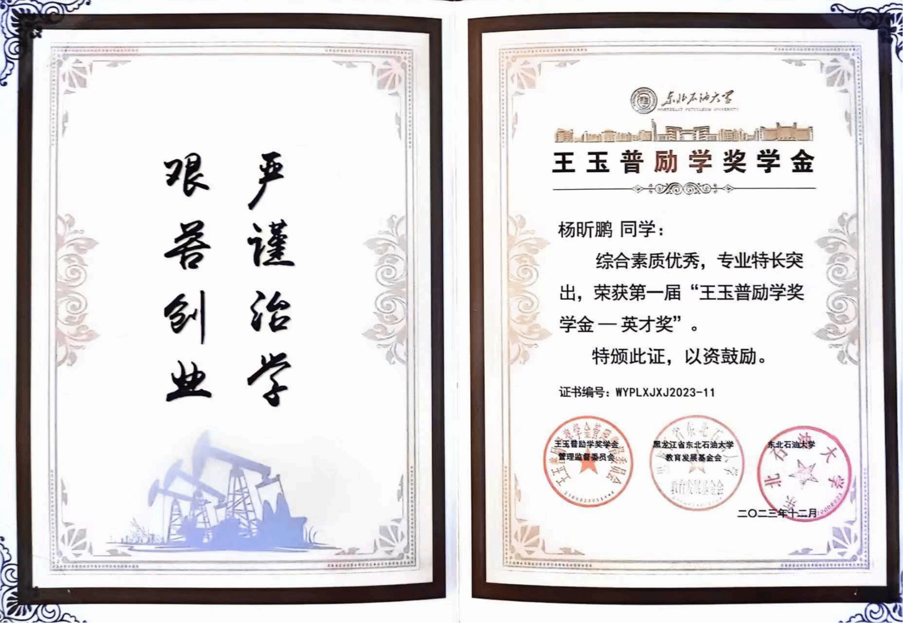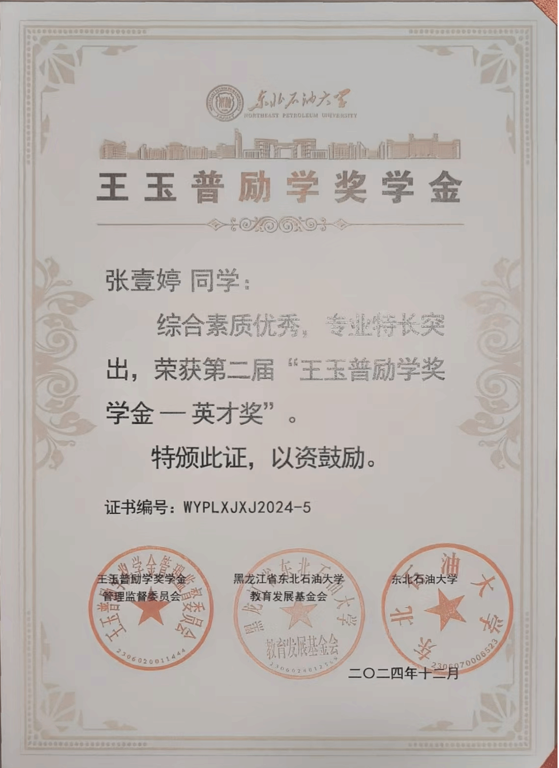 10. 学生培养质量明显提升。五年来,1464人,硕士研究生325人,博士研究生4人。1名博士生荣获“中国大学生自强之星”、人民网奖学金、“大学生年度人物”入围奖,1名本科生荣获“中国大学生自强之星”,1名学生获评“黑龙江省助力‘兴边富民’计划大学生支教团优秀志愿者”荣誉称号。1篇博士学位论文获评“新时代龙江优秀博士学位论文”重点项目。国家奖学金获得者29名,国家励志奖学金获得者246名,中石油奖学金获得者17名,王涛奖学金1名,王玉普奖学金3名,校“学术之星”4名。