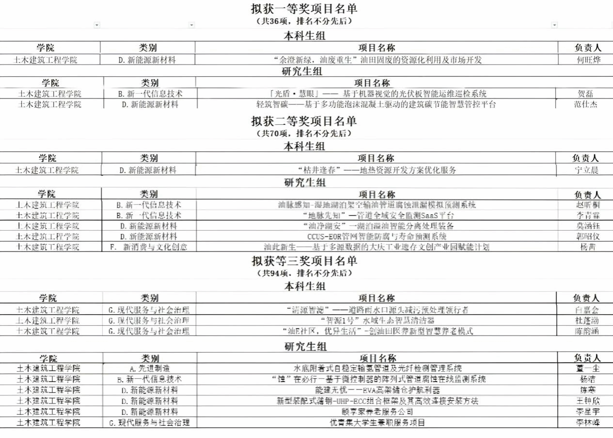 本次竞赛中,我院3个一等奖项目分别聚焦油田固废资源化利用、光伏板智能运维巡检以及多功能泡沫混凝土智慧管控平台,均属于新能源新材料与新一代信息技术领域。6个二等奖项目涵盖管道安全监测、油污智能分离、地热资源开发、工业遗存文创赋能等多个方向,展现了学院多学科交叉融合的创新活力。