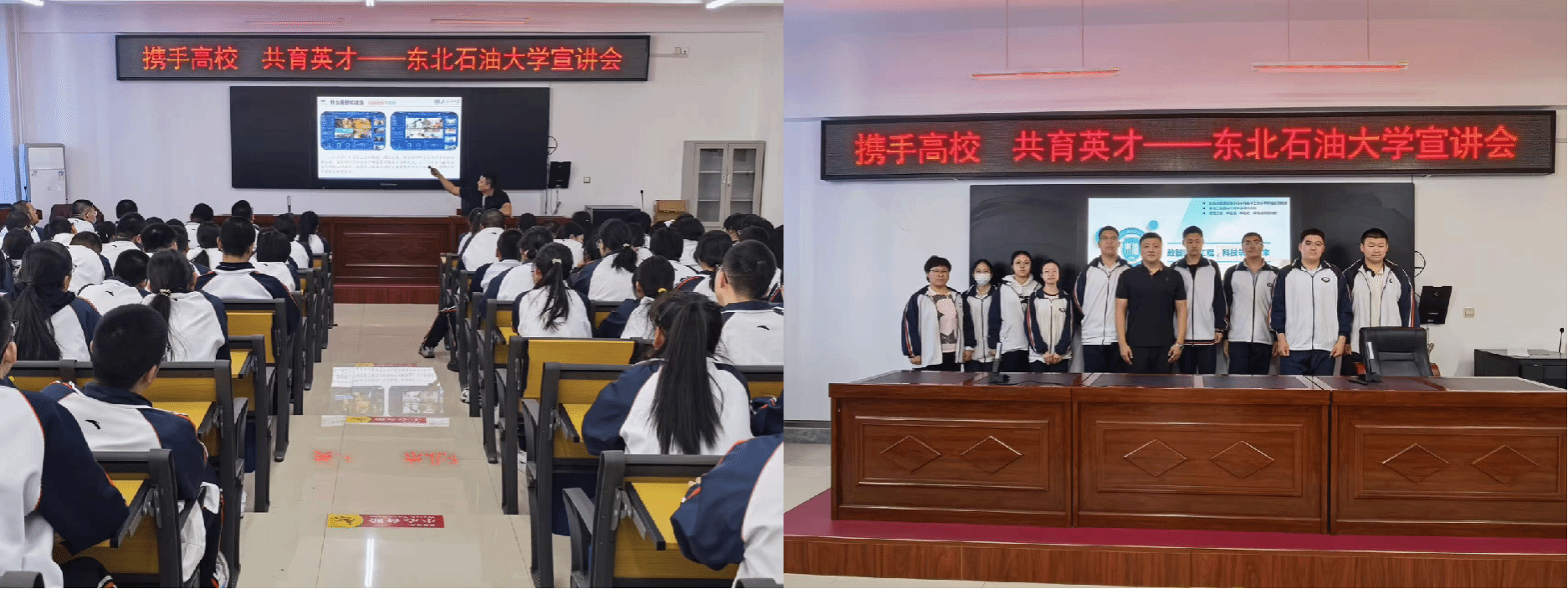 交流座谈中,王桐向两所学校领导详细介绍了我校基本情况、育人优势、办学成就及人才培养特色等。他提到,东北石油大学是一所有着65年深厚积淀的能源大学,始终坚持“质量立校、人才强校、特色兴校、文化润校”的办学理念,坚持“强陆、拓海、壮新”的发展战略,构建了独具特色的“大庆精神”育人体系。近年来在学科建设、科研成果、人才培养等方面均取得显著成绩。同时,王桐代表学校,对黑龙江省各级教育部门及两所中学给予我校招生宣传工作的大力支持表示衷心感谢,并期待未来能在优质人才培养、高等教育与基础教育衔接等方面开展更深层次的合作。