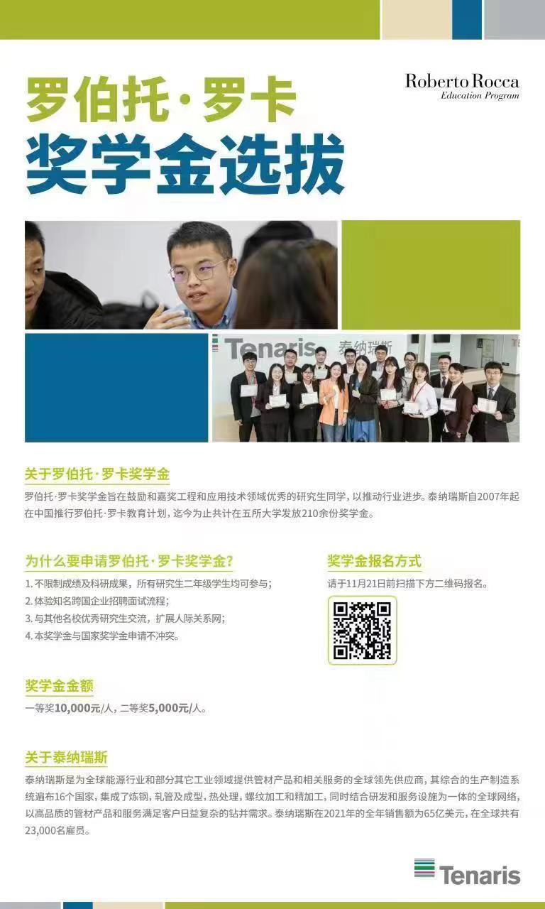 据悉:泰纳瑞斯“罗伯托·罗卡”奖学金项目(RREP)向工程和应用科学领域优秀的研究生提供奖学金,鼓励学生进行科学研究,推动行业技术进步。目前,奖学金已覆盖全球各地包括阿根廷、加拿大、中国等国家的80多所公立和私立大学,每年支持700多位学生,迄今为止在中国区已颁发了15届共计200多份“罗伯托·罗卡”奖学金。