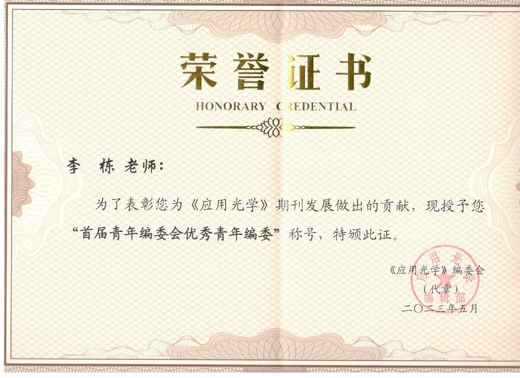 5月26日下午,《应用光学》第十一届编委会暨第二届青年编委会换届会议召开。《应用光学》第十届编委会主编纪明作《应用光学》第十届编委会暨首届青年编委会工作报告。《应用光学》编委会副主任委员、上海理工大学韩森教授宣读第十届编委会优秀编委及首届青年编委会优秀青年编委名单,我院李栋教授当选《应用光学》期刊第十一届编委会编委并荣获“首届青年编委会优秀青年编委”称号(首届青年编委成员49名,仅10人入选)。会后,我院参会师生与《应用光学》编辑部相关工作人员就开展专题组约稿进行交流。