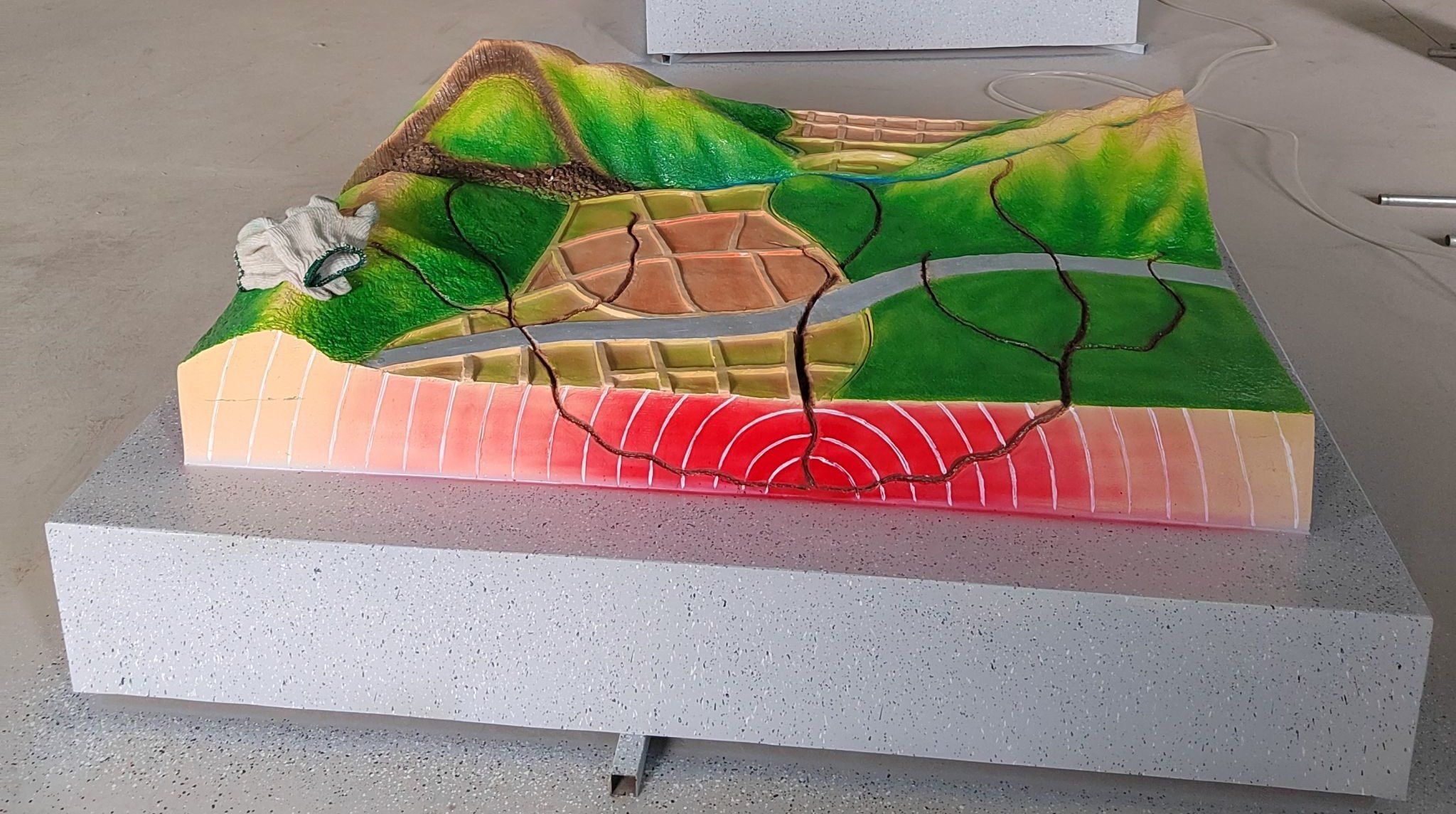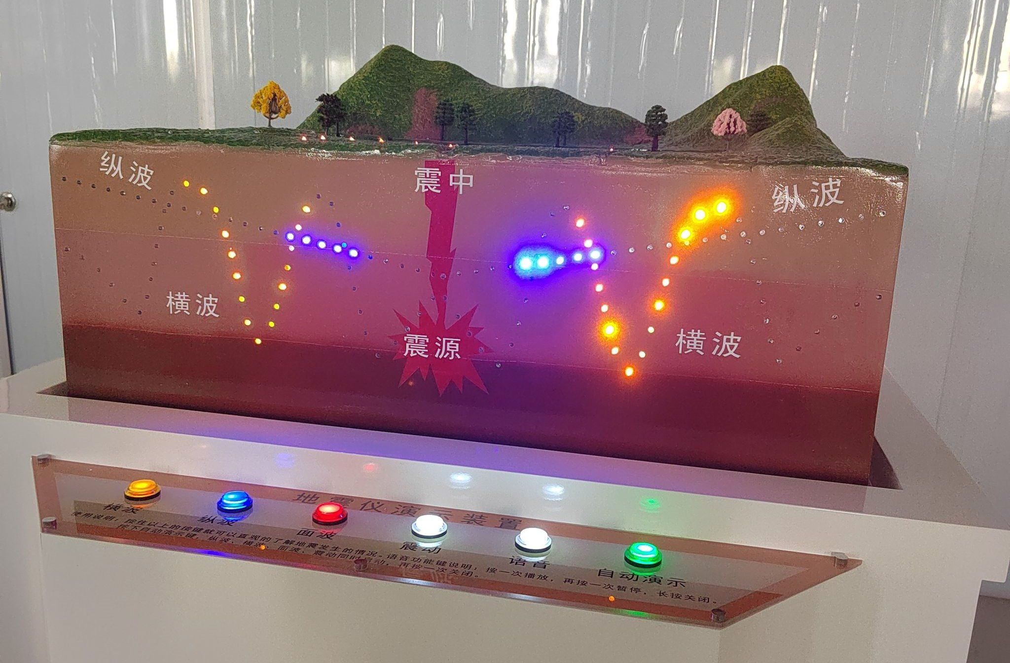 地质构造及地震地貌模型能够清楚地呈现在天然地震发生过程中,对地表外貌形态的改造,以及对地形的影响,是地震破裂作用在地表的直接证据。地震演示仪可通过模拟演示地震发生时横波及纵波的传播过程,清楚直观地展现地震发生时对地表的影响。通过这些模型的展示,使参观者更加具体系统地了解地震及防灾减灾方面知识,激发了参观者防震减灾的潜在意识。