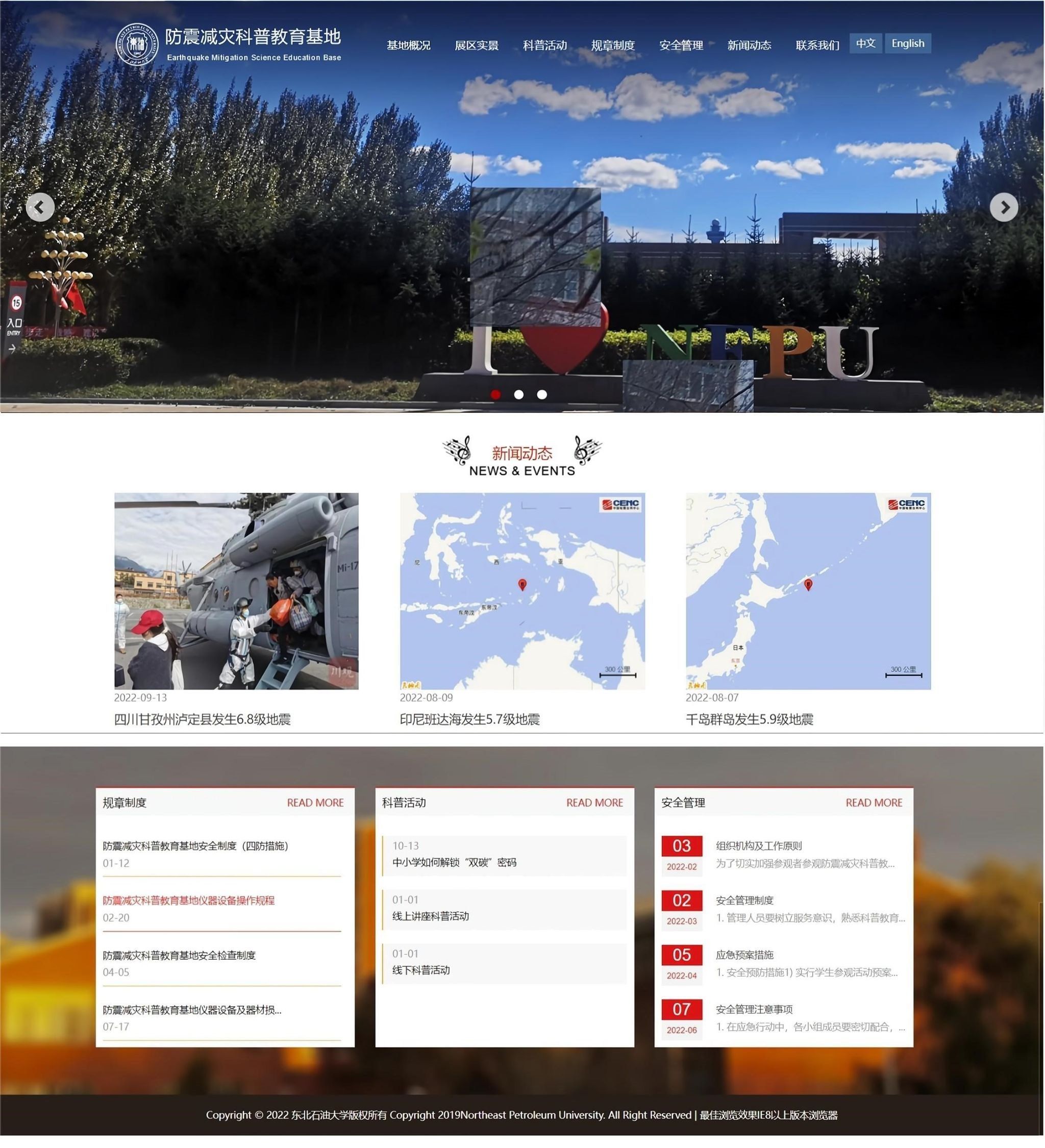 为切实做好防震减灾科普教育基地的宣传工作,科普教育基地制作了防震减灾科普教育基地宣传手册(图1),并建立东北石油大学防震减灾科普教育基地官方网站(http://114.116.18.90/haohan08/)(图2)。科普基地网站设有基地概况、展区实景、科普活动、规章制度、安全管理、新闻动态等版块,已成为科普基地信息公开的主要渠道和服务公众、与公众交流互动的重要平台。通过基地网站,使防震减灾科普知识信息化、数字化,并及时发布活动通知、更新新闻动态,方便大众获取防震减灾科普知识,了解基地活动情况以及地震相关新闻,有利于推进防震减灾科普宣传工作的开展。