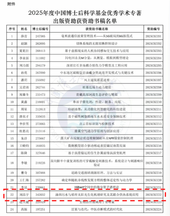 9月19日中国博士后科学基金会发布,根据《中国博士后科学基金资助规定》和《中国博士后科学基金资助指南(2025年度)》,经专家评审、选题论证及公示,决定对24部书稿给予中国博士后科学基金优秀学术专著出版资助。我院建环系党支部书记系主任刘昌宇教授的专著《油田污水与秸秆太阳光生化机理研究及其联合供热系统应用》获得资助是本年度我校唯一获得资助的青年学者。刘昌宇作为校级培育“双带头人”教师党支部书记在基层党组织活动创新立项课题的支持下,积极践行“党建+学科+科研”融合发展的新模式,发挥较好的示范带头作用。下一步将继续带领支部党员教师发挥业务优势,创造更多的高水平成果。