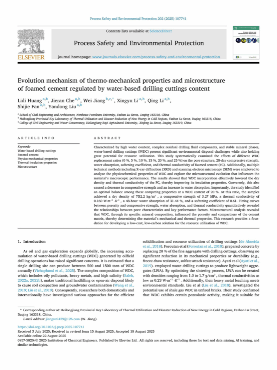 近日,我院寒区低碳材料与新型节能体系团队2023级在读硕士研究生车杰然在国际权威期刊《Process Safety and Environmental Protection》上发表题为“Evolution mechanism of thermo-mechanical properties and microstructure of foamed cement regulated by water-based drilling cuttings content”的研究论文,论文第一作者为我院寒区低碳材料与新型节能体系团队黄丽蒂教授,硕士生车杰然为第二作者,黑龙江八一农垦大学姜伟教授为通讯作者。该项研究制备了含有不同质量分数水基钻井岩屑(WDC)的发泡水泥复合材料,讨论其宏观性能演变及微观机制,以推动油田固废资源化利用,助力低碳绿色建材的发展。