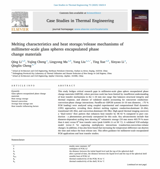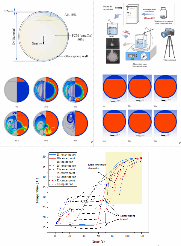 近日,我院寒区低碳材料与新型节能体系团队2023级在读硕士研究生程宇晶在国际权威期刊《Case Studies in Thermal Engineering》上发表题为“Melting characteristics and heat storagerelease mechanisms of millimeter-scale glass spheres encapsulated phase change materials”的研究论文,论文第一作者为寒区低碳材料与新型节能体系团队李清副教授,硕士生程宇晶为第二作者,我校成庆林教授、齐齐哈尔大学刘洋讲师为共同通讯作者。本研究探索固含量大于75%的毫米级相变玻璃微球(GSPCM)的传热及蓄/释热机制,采用实验和计算流体动力学(CFD)方法对石蜡-空气的相变微球(直径6至10毫米)的熔化传热过程进行了研究。
