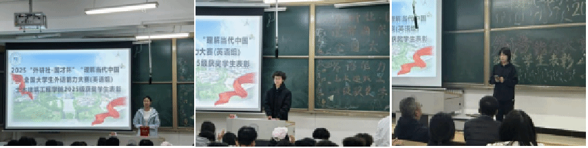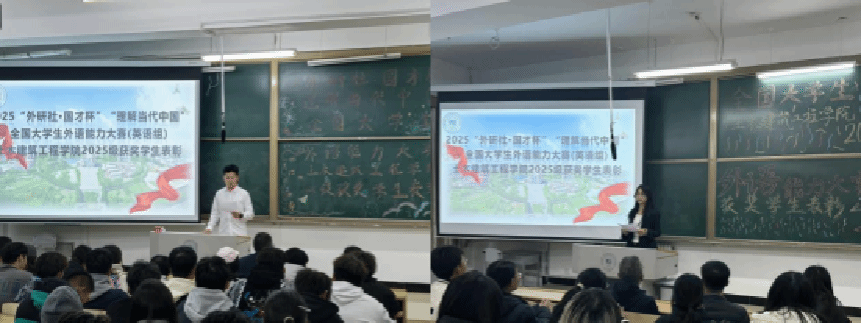 10月14日,学院于第二教学楼2A104、2A107举行2025级“外研社・国才杯”“理解当代中国”全国大学生外语能力大赛(校赛)获奖学生表彰活动。土木建筑工程学院领导班子、辅导员及2025级土木工程、建筑环境与能源应用工程专业学生参加本次活动。
