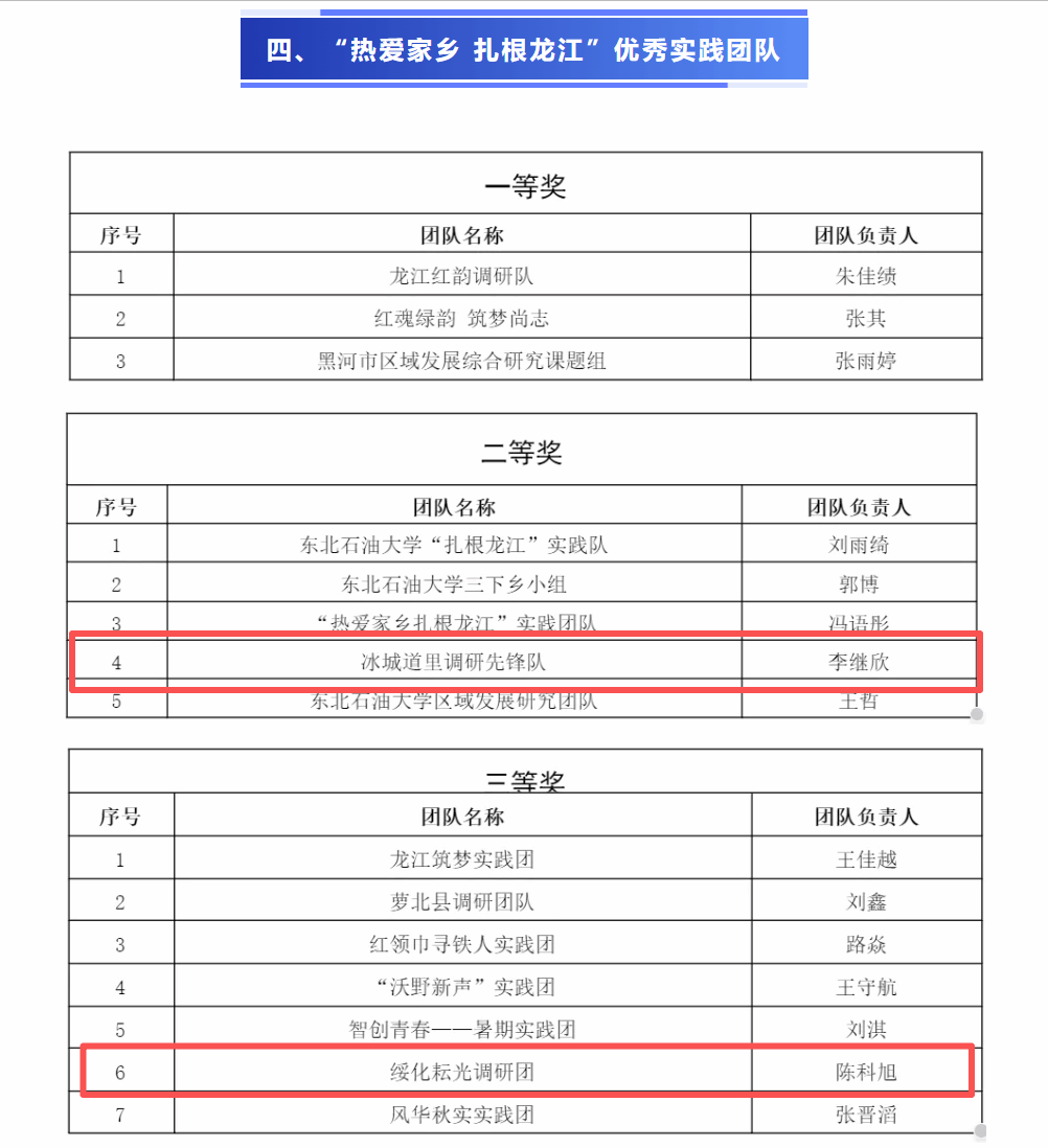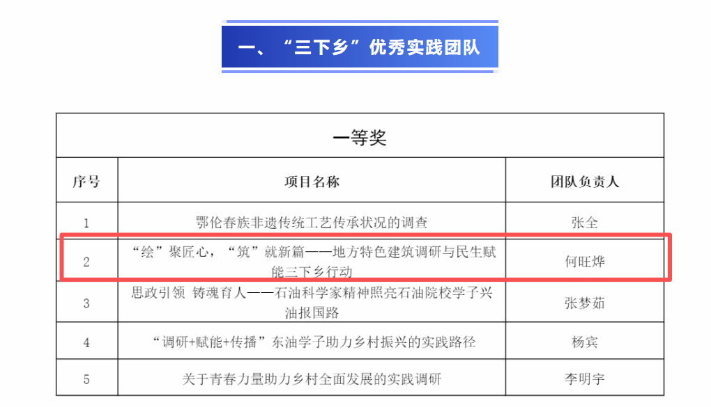 由何旺烨(建筑23-1班)负责的《“绘”聚匠心,“筑”就新篇——地方特色建筑调研与民生赋能三下乡行动》团队,凭借其扎实的调研内容和显著的实践成果,荣获“三下乡”优秀实践团队一等奖,实践事例获“中华网”“中国网”等主流媒体报道。在“热爱家乡 扎根龙江”专题实践活动中,由李继欣(土木智慧建工24-2班)带领的“冰城道里调研先锋队”荣获优秀实践团队二等奖,陈科旭(建筑23-1班)带领的“绥化耘光调研团”荣获优秀实践团队三等奖。王媛媛、耿洁荣获“优秀指导教师”称号,学院获得“优秀组织单位”。