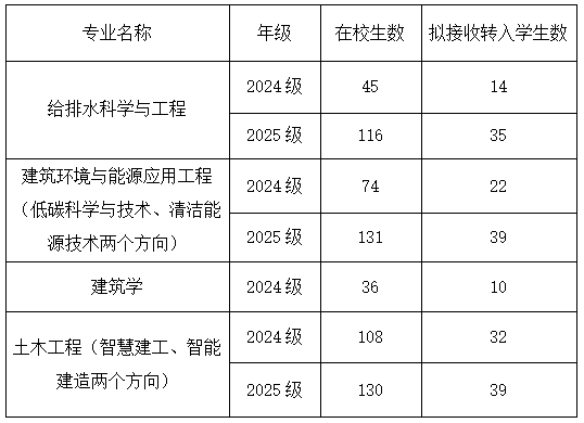 遵照学校接收转入学生比例不超过专业人数30%的要求,土木院各专业接收大一、大二的转专业学生名额如下所示: