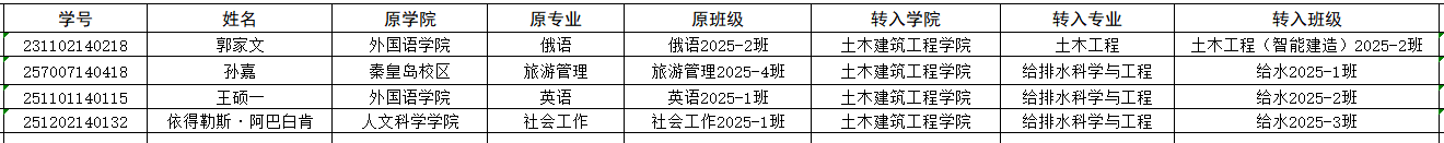 根据《东北石油大学转专业与转学实施办法(修订)》(东油校发〔2024〕99号)文件规定,经学生本人申请,学院转专业领导小组审核通过,土木建筑工程学院拟录取4名转专业学生,现予公示如下: