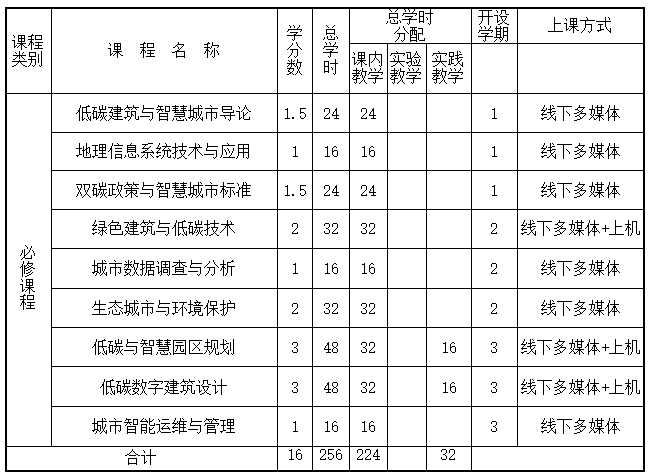 课程包括:低碳建筑与智慧城市导论、地理信息系统技术与应用、双碳政策与智慧城市标准、绿色建筑与低碳技术、城市数据调查与分析、生态城市与环境保护、低碳与智慧园区规划、低碳数字建筑设计、城市智能运维与管理。