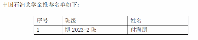 根据《关于评选2025年研究生“中国石油奖学金”的通知》,现对我院2025年中国石油奖学金初审结果进行公示(共1人)。2025年11月12日,经土木建筑工程学院奖学金评选小组开会讨论,确定推荐以下同学获得研究生中国石油奖学金。