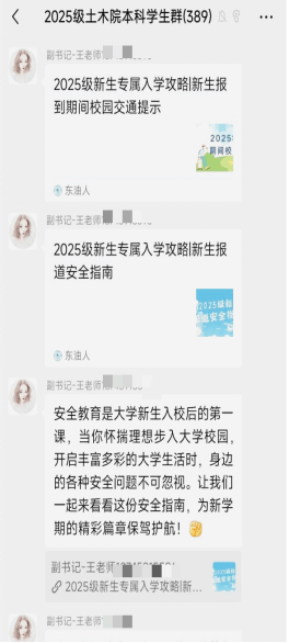 “用心”宣传,夯实思想阵地。为增强新生对学院的认同感与凝聚力,辅导员提前组建年级及班级联络群,主动与新生互动沟通,精准掌握学生基本情况及到校安排。学院官方新媒体平台“东油土木”持续推送“报到指南”“迎新进展”等主题内容,系统介绍学院概况、报到流程、安全注意事项等信息,搭建起学习型、服务型、互动型线上迎新服务平台,让每一位新生切实感受到土木大家庭的温暖。