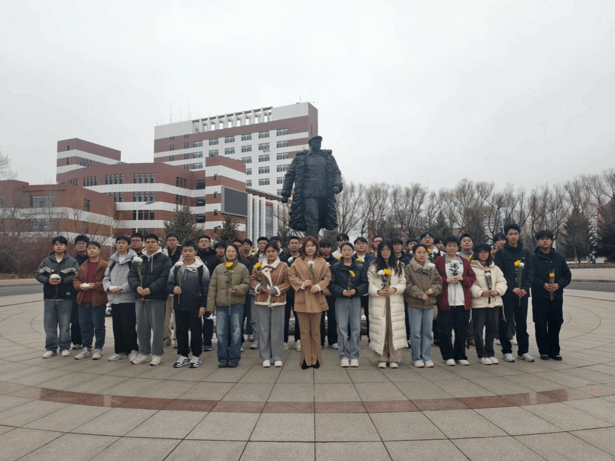 全体师生随后前往学校铁人雕像广场举行敬献仪式。在铁人雕像前,大家肃立注目、集体默哀,向石油先辈致以崇高敬意。耿洁老师与同学们依次上前,敬献亲手制作的纸花并深深鞠躬,以庄重行动传递追思与敬仰。