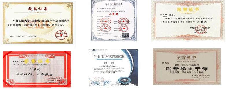 除了课程学习外,我还积极参加学科竞赛,并取得不错的成绩。如:第二届全国大学生C语言程序设计大赛“三等奖”、第三十九届全国部分地区大学生物理竞赛(东北石油大学赛区)“三等奖”、第一届“龙行杯”雪雕大赛“铜奖”、东北石油大学结构设计大赛“二等奖”、第十六届全国大学生数学竞赛(非数学A类)“三等奖”。